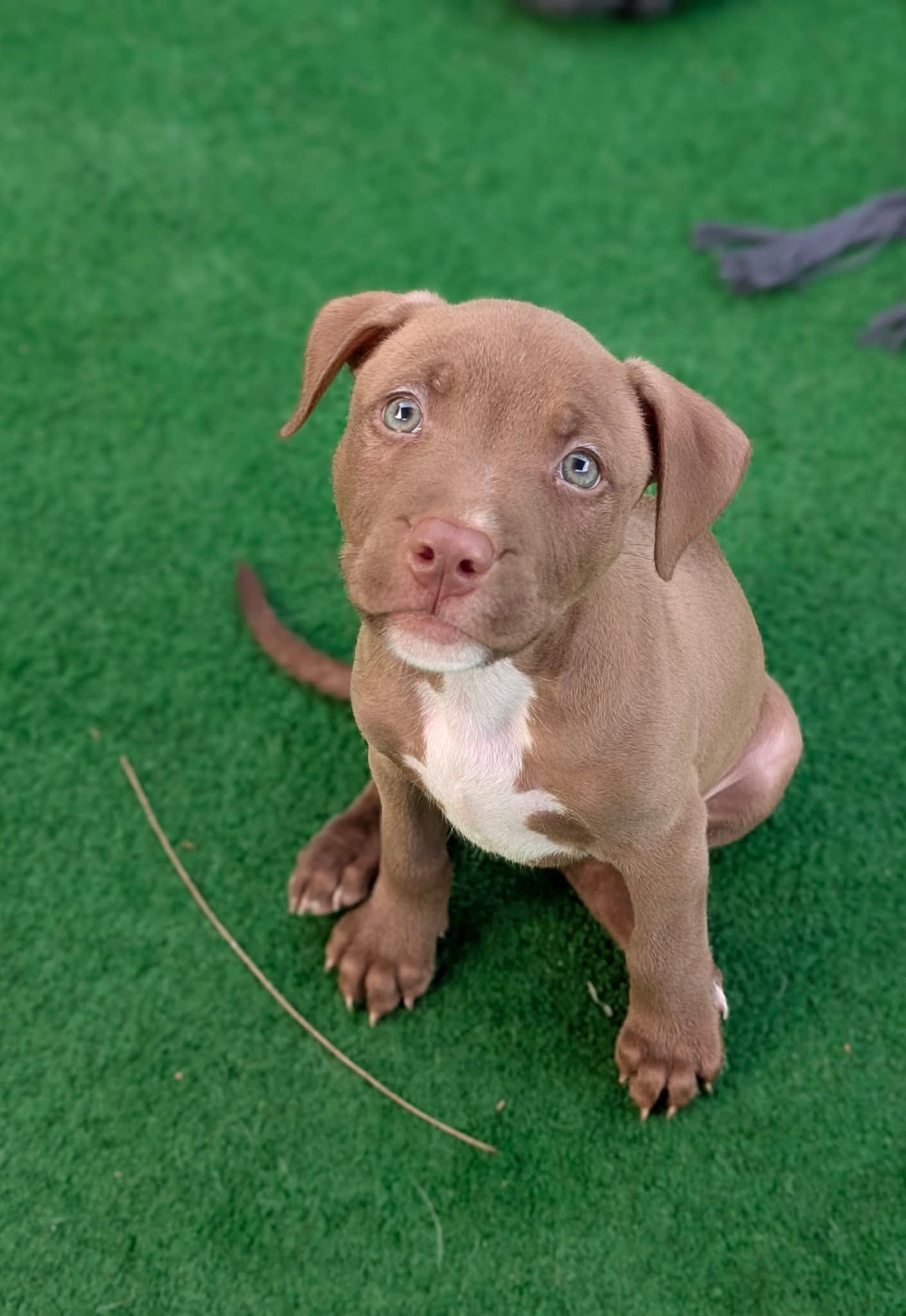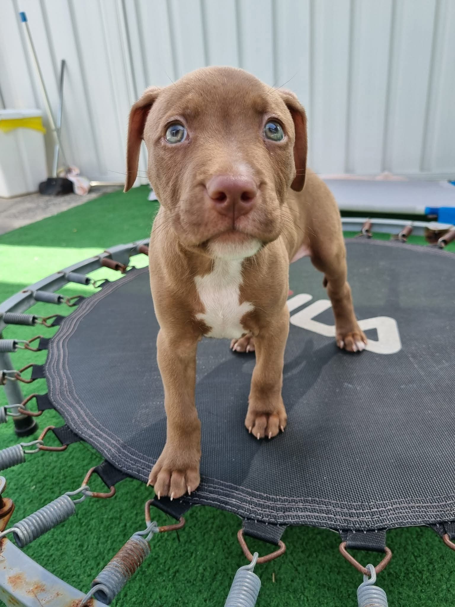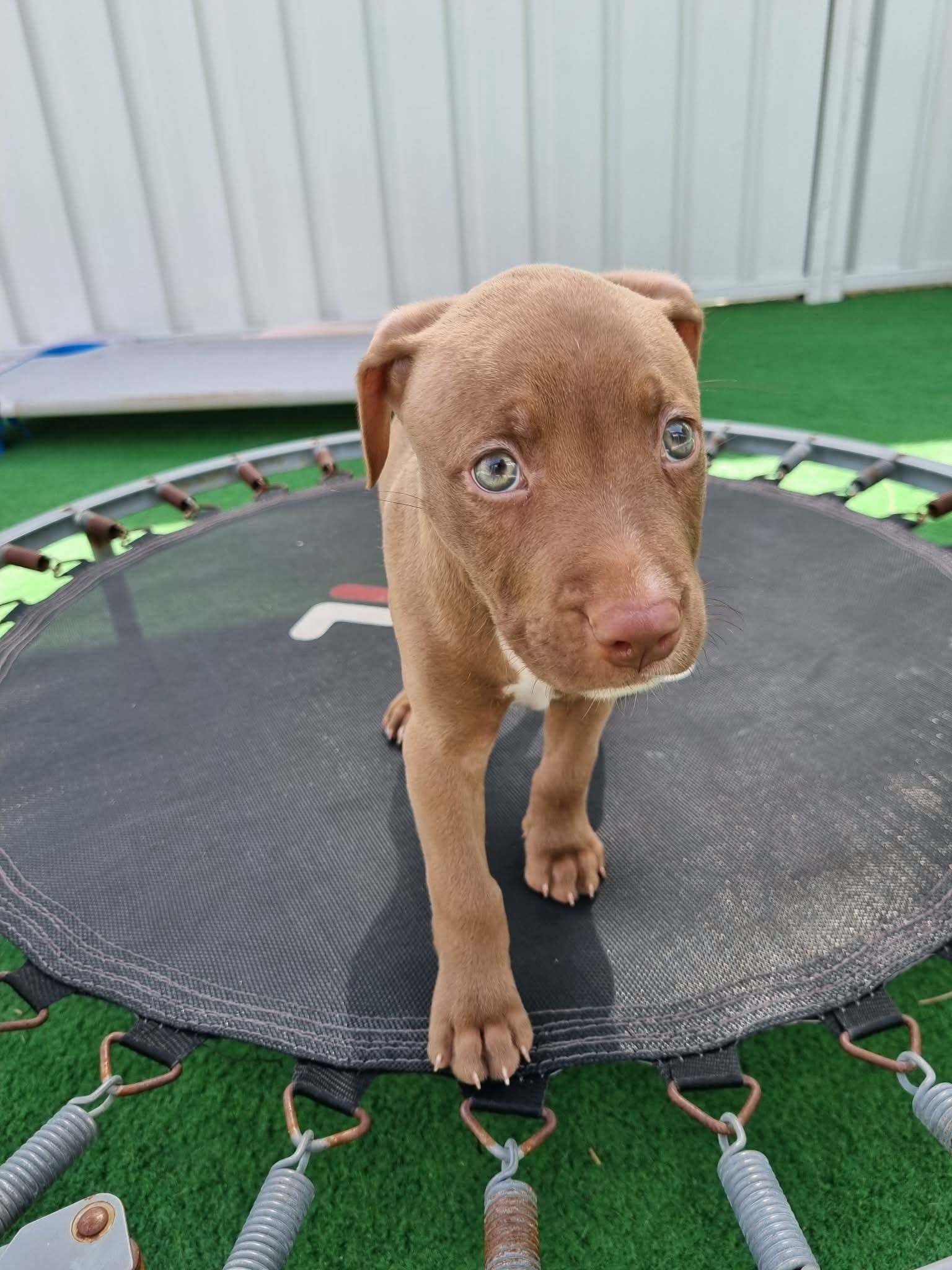 Typical to a staffy pup nature he is highly energised, curious about everything, runs laps around your feet & jumps up for attention.